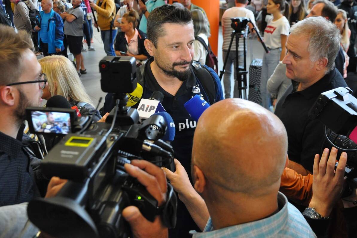 To nie przeszkodziło kibicom i przede wszystkim przedstawicielom mediów licznie oczekiwać Bartłomieja Bołądzia, Jędrzeja Gruszczyńskiego, Marcina Janusza, Piotra Łukasika i Andrzeja Wrony, ktrórym towarzyszył trener Jakub Bednaruk, a także lekarz ekipy Sebastian Żabierek. Lekko opóźniony lot sprzyjał atmosferze wyczekiwania. W imieniu Polskiego Związku Piłki Siatkowej naszych brązowych medalistów powitał szef Pionu Wyszkolenia PZPS Włodzimierz Sadalski. Następnie reprezentanci Polski chętnie i wyczerująco odpowiadali na pytania dziennikarzy.