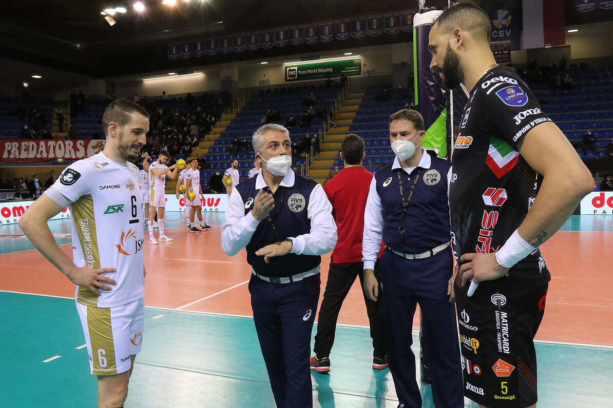 Jan Hadrava, który wybrany został MVP dzisiejszego spotkania, występował w tym utytułowanym włoskim klubie przez jeden sezon i sięgnął z nim po mistrzostwo, Puchar oraz Superpuchar Włoch. Z kolei, Benjamin Toniutti w minionym sezonie pokonał mistrzów Włoch 3:1 na ich terenie również w ćwierćfinale Ligi Mistrzów, kończąc sezon 2021 z Pucharem Europy.