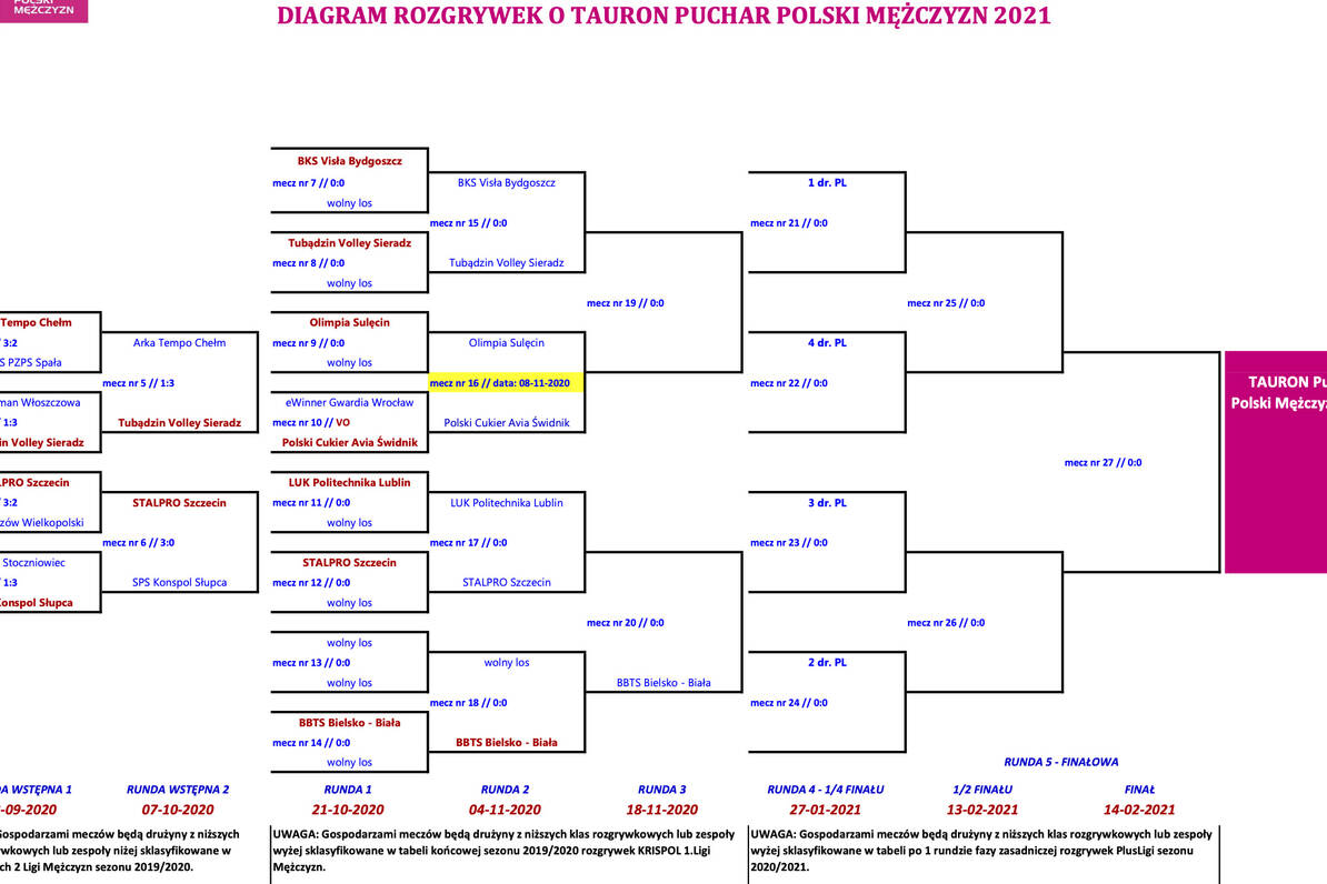 Trwa walka o awans do kolejnych rund TAURON Pucharze Polski Mężczyzn 2021. Poniżej znajdziecie pełne i najnowsze wyniki oraz terminarz i regulamin rozgrywek (w załącznikach).