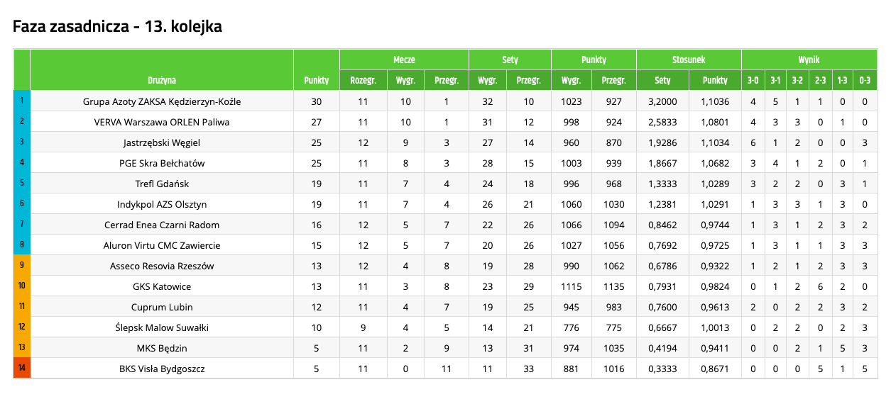 Bardzo blisko awansu są Trefl Gdańsk i Indykpol AZS Olsztyn – obie drużyny mają po jedenaście rozegranych meczów i 19 punktów na koncie. Jedyną drużyną, która może jedną z nich jeszcze wyprzedzić jest beniaminek Ślepsk Malow Suwałki.